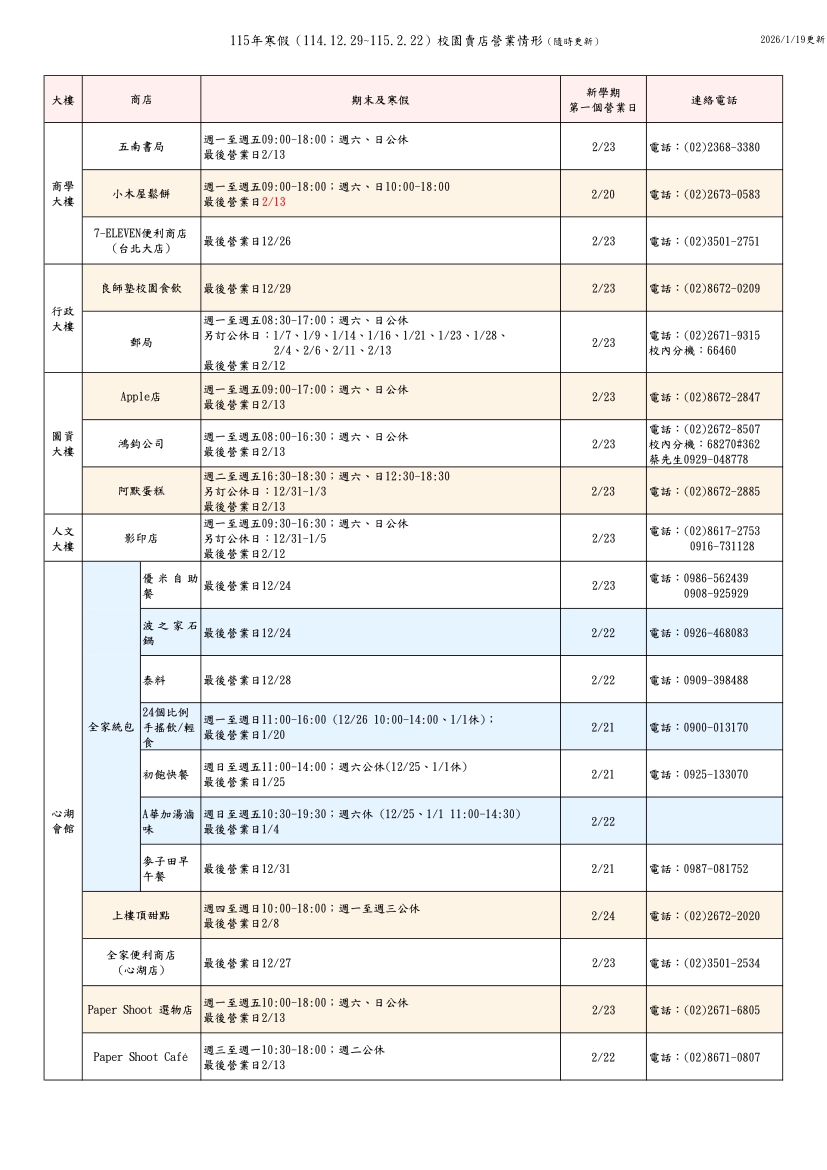【115年寒假期間校園賣店營業時間】(隨時更新)